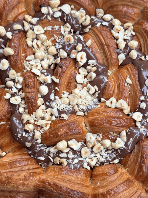 Indulge in pure decadence with our Hazelnut Chocolate Croissant Nest, crafted from layers of flaky, golden croissant pastry shaped into a delicate nest. Filled with a rich blend of smooth chocolate and creamy hazelnut, each bite is perfectly balanced with crisp, buttery layers and a luscious, melt-in-your-mouth center. Finished with a drizzle of chocolate and topped with crushed hazelnuts for the perfect crunch, it’s the ultimate treat for chocolate lovers.
