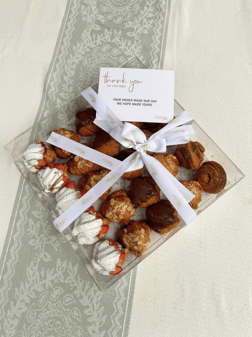 A perfect bite-sized indulgence for every craving, our Mini Croissant Assorted Box features a delightful selection of freshly baked, golden, flaky croissants in five irresistible flavors. Enjoy the sweetness of strawberry custard and rich chocolate, the nutty crunch of almond, and the savory goodness of creamy labneh and aromatic zaatar. Light, buttery, and perfectly balanced, this assorted box is ideal for sharing, gifting, or treating yourself to a little bit of everything.