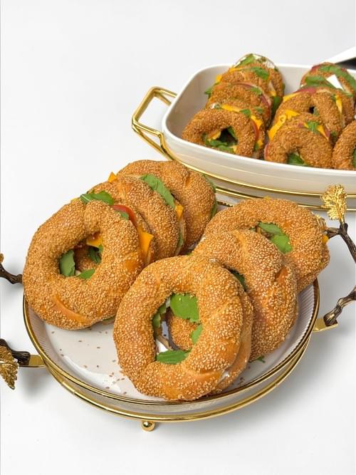 Freshly baked simit sandwiches made with sesame-topped simit bread which is crisp on the outside and soft, fluffy inside, filled with delicious Mediterranean flavours: